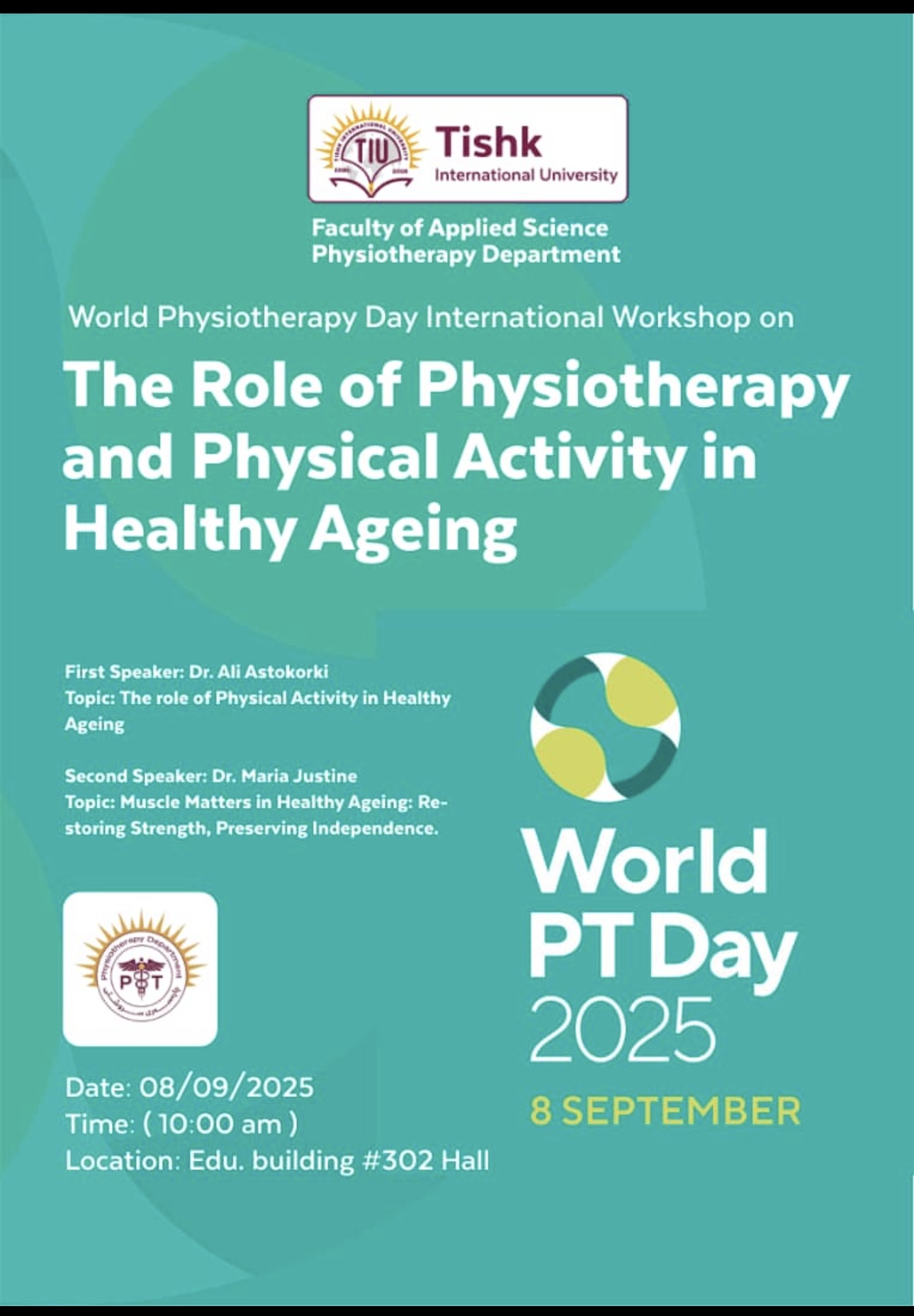Web Admin2025-10-16T16:34:17+03:00The Physiotherapy Department at Applied Science Faculty of Tishk International University (TIU), in collaboration with the Physiotherapy Department of Hawler Medical University (HMU), successfully organized an international workshop to commemorate World Physiotherapy Day 2025. The event, held on September 8, 2025, at Tishk International University, focused on the theme “The Role of Physiotherapy and Physical Activity in Healthy Ageing.” The workshop brought together academic experts, faculty members, and students to highlight the essential contribution of physiotherapists in promoting health, enhancing mobility, and improving quality of life among ageing populations. the speakers were Dr. Ali Astokorki, Head of the Physiotherapy Department at Hawler [...]