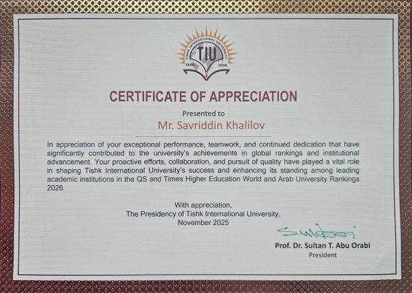 Among the awardees, Mr. Savriddin Khalilov, Head of the IT Department, received an Appreciation Certificate for his excellent performance. His leadership in upgrading digital systems, improving data processes, and supporting modern technology integration significantly contributed to TIU’s ranking achievements. His work strengthened the university’s digital infrastructure and enhanced overall academic operations.